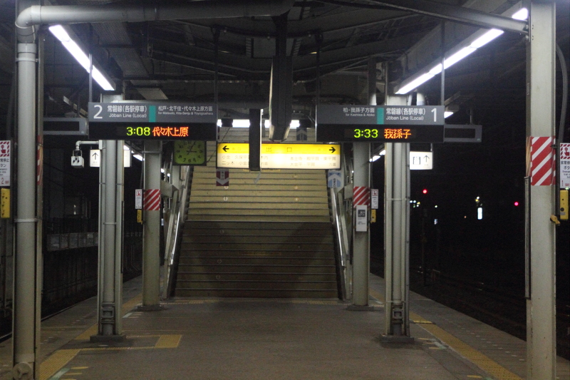 洗濯を行いながら、旅行の準備を進め、22時過ぎに自宅を出発。北小金22:29発の代々木上原行きに乗車し大手町へ。普段なら松戸で快速に乗り換えて、JRで東京に向かうところだが、停電の影響で快速線の列車本数が少なく、時刻も不明なため、確実な方法をとることにした。大手町で丸ノ内線に乗り換えるが、乗り換え通路のエスカレーターが動いてない。これは予想外だった。北小金駅のエスカレーターは動いていたのに。後で知ったことだが、JR東日本では階段が併設されていないエスカレータは動かすと言う方針だったらしい。このため北小金駅のエスカレータは動いていたのだ。