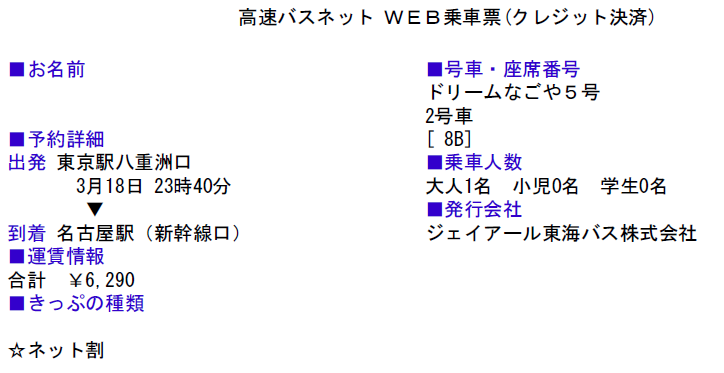 丸ノ内線で1駅、東京駅到着後、高速バス乗り場へ。連休前の金曜日であるせいか、夜行バスの乗り場は人が多く、乗降に手間取っており、バスの発車にも若干遅れが出ている。23:30過ぎに自分の乗るバスが入線したため、Web乗車票を提示して乗り込む。自宅で運賃の決済ときっぷプリントアウトが出来るのは非常に便利だ。日本の鉄道の場合、自動改札使用を前提とする以上、プリントアウトした乗車券でそのまま列車に乗ると言う運用はしにくいのは確かだが、せめてきっぷの受け取りをもう少し便利にしてほしいものだ。JR各社の縄張りなど利用客にとってはどうでもいいことである。