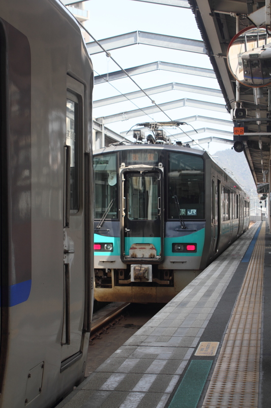 東舞鶴駅は島式ホーム1本しかないが、1本の線路を前後に分けて使っていて、当駅始終発の普通列車同士を接続させていた。いたずらにホームを増やすよりも、乗客にとっては便利な運用方法だ。編成が短い線区同士の接続駅は、この様な形態が理想だろう。この先福知山で再度乗り換えたが、逆にホームの数が多く、乗り換えは必ずしも便利ではない。福知山からは223系の5500番台。初乗車である。城崎温泉で再度乗り換え。城崎は電化区間の終点、特急列車の終点と言うことで、もっと大きな街を想像していたが、案外こじんまりした印象の駅であった。城崎温泉からはキハ47の2連である。この先、翌日も含め延々とキハ47の2連にお世話になることになった。島根県と鳥取県の援助で導入したキハ121・126系以外、普通列車には全く新車が入っていない。キハ40系は音ばかり大きくて全然前に進まないため、あまり好きな車輌ではない。特に並行する道路を走る車に抜き去られていくのは屈辱的だ。