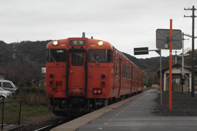 ここで再び乗り換えて電鉄出雲市へ。出雲市からは再び山陰本線に乗り、西を目指す。15:08発の浜田行きに乗った。日の出ている内に江津まで乗り潰せれば良いので、ORITADEを狙う。まずは特急列車の退避と行き違いのため長時間停車した波根で下車。