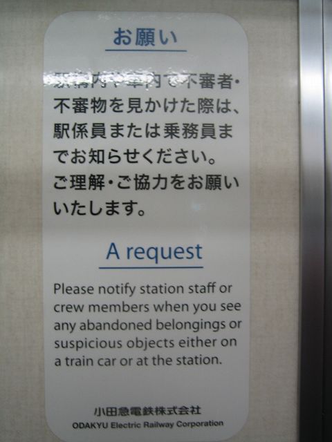しかも高校生が辞書見ながら翻訳したような文だし・・・だいたい駅員や乗務員もほとんど英語なんて話せないだろうし、非日本語話者だけが車内にいて、不審物を発見するという状況も考えにくい。それなら非常用ドアコックの説明を英語書きするほうがまだ役に立ちそうだ。それに最優先事項は次駅案内だろう。"Next Stop Haruhino" 程度の案内は車掌が肉声で出来るだろうに。まあ良い、この会社は非日本語話者のことなど考えていないのだから。